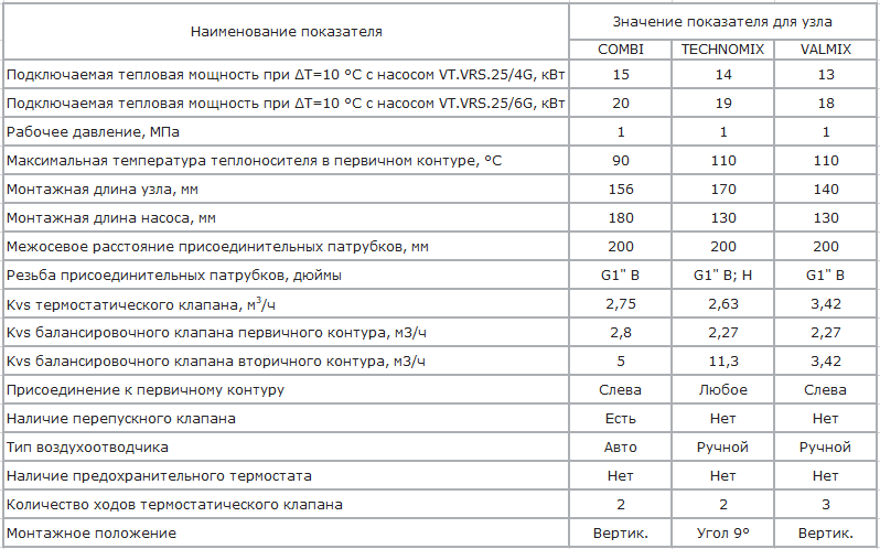 Насосно-смесительные узлы в системе теплых полов: мощность и сфера применения CombiMix, Technomix, Valmix и бюджетных решений.