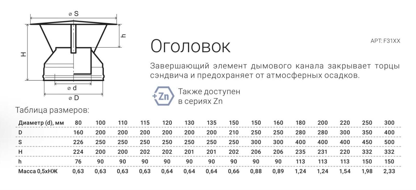 Для защиты слоя теплоизоляции от атмосферных осадков и предотвращения их попадания в канал дымохода, рекомендуется использовать оголовок Феррум 280/180. Этот элемент изготовлен из нержавеющей стали толщиной 0,5 мм AISI 430 и является завершающим элементом дымового канала. Он устанавливается на двухстенный дымоход.