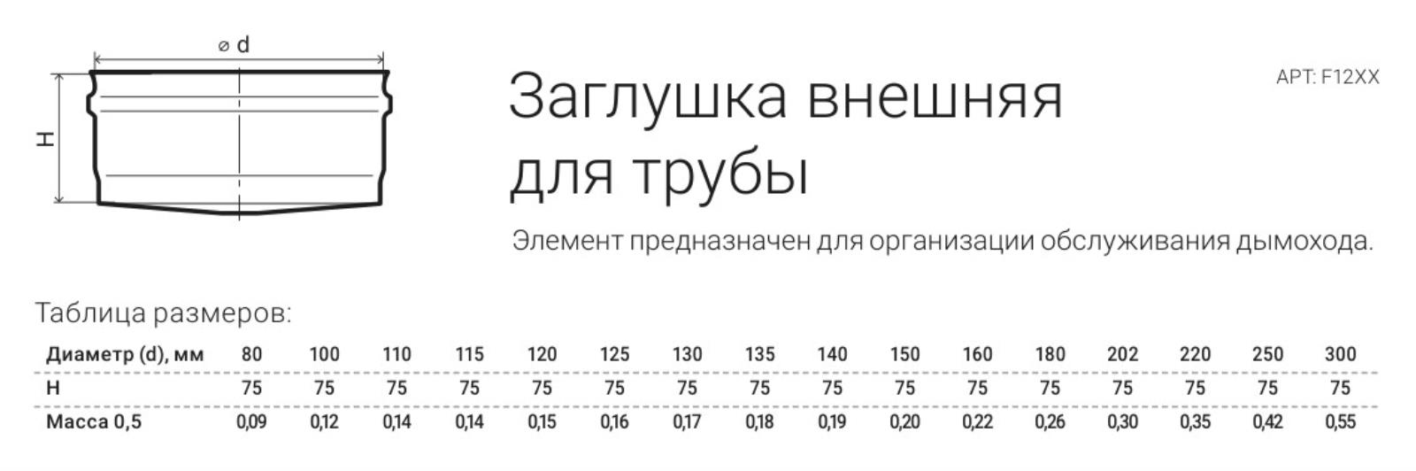 Заглушка для дымохода Ferrum внешняя (430/0,5 мм) предоставляет возможность осуществления обслуживания и ревизии дымохода. Она предназначена для использования в системе с раструбом, и ее надевают на узкий край участка дымохода. Вместе с тройниками и опорными площадками она создает одноконтурную систему. Заглушка не имеет ручек.