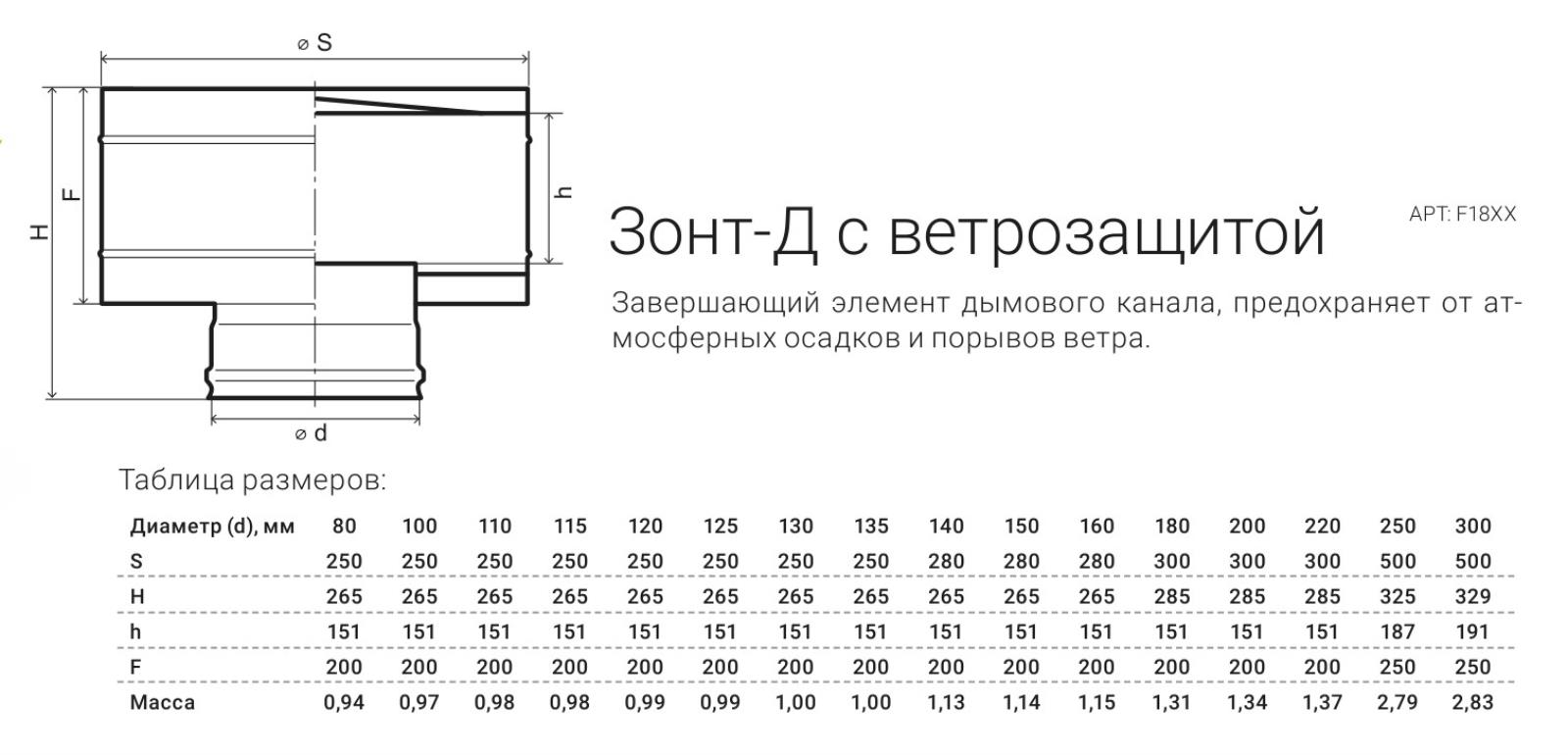 Зонт с защитной полосой, известный как дефлектор, является конечным компонентом системы дымохода. Его основная функция заключается в выравнивании тяги при изменениях ветровых условий или недостаточной высоте трубы, а также в защите дымохода от осадков. Установка дефлектора рекомендуется в подветренных районах, где существует опасность возникновения обратной тяги из-за сильного ветра или с целью предотвращения загрязнения канала различными материалами, такими как листья, пух, насекомые, птицы и т.д. Основной материал, используемый для изготовления данного элемента, обычно является нержавеющая сталь, что обеспечивает его долговечность и надежность в эксплуатации.
