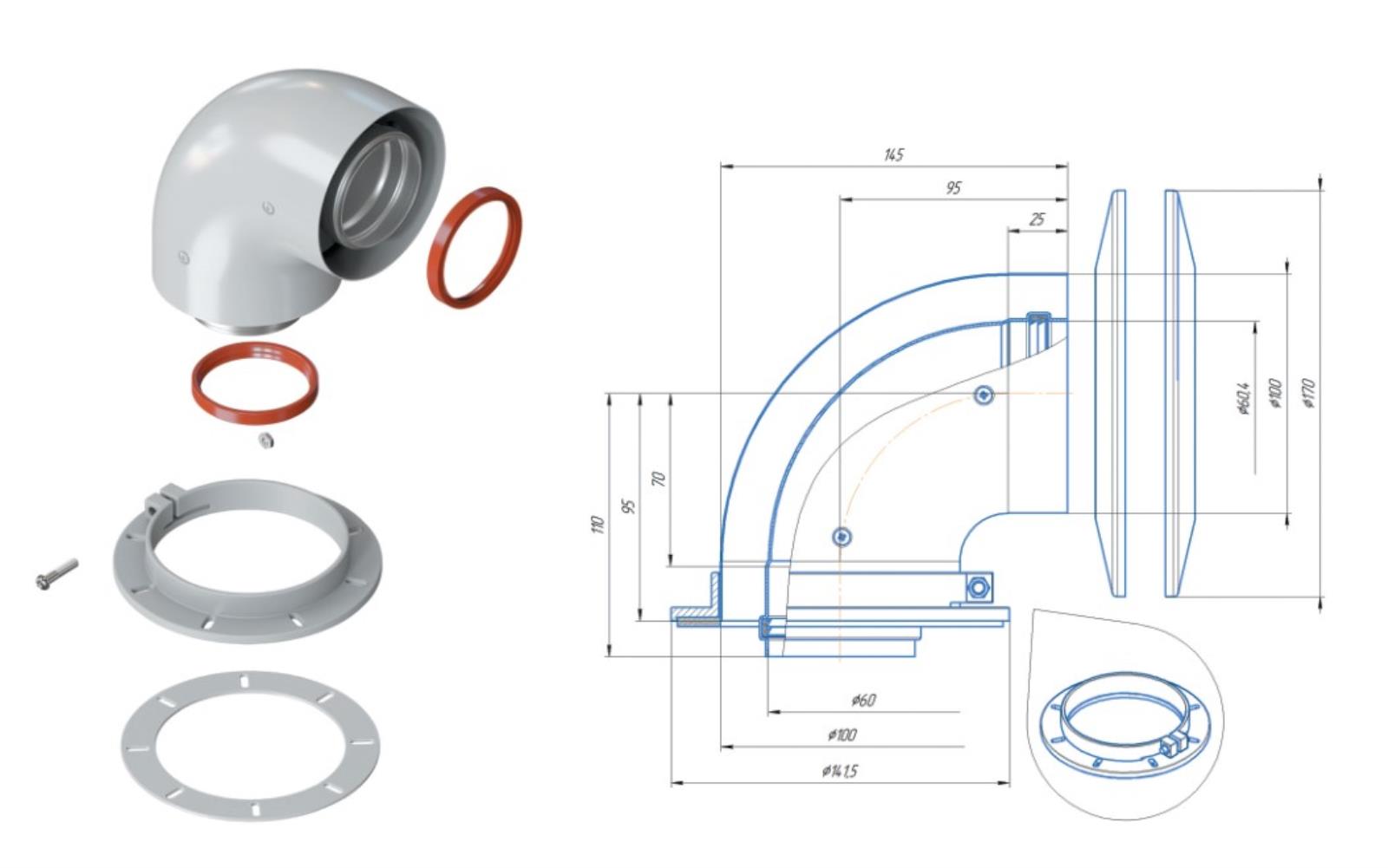 Отвод коаксиальный 60/100 (Navien S/C/E, Baxi ECO Nova/Classic, Fondital, Bosch, Buderus) KRATS (K-02F)