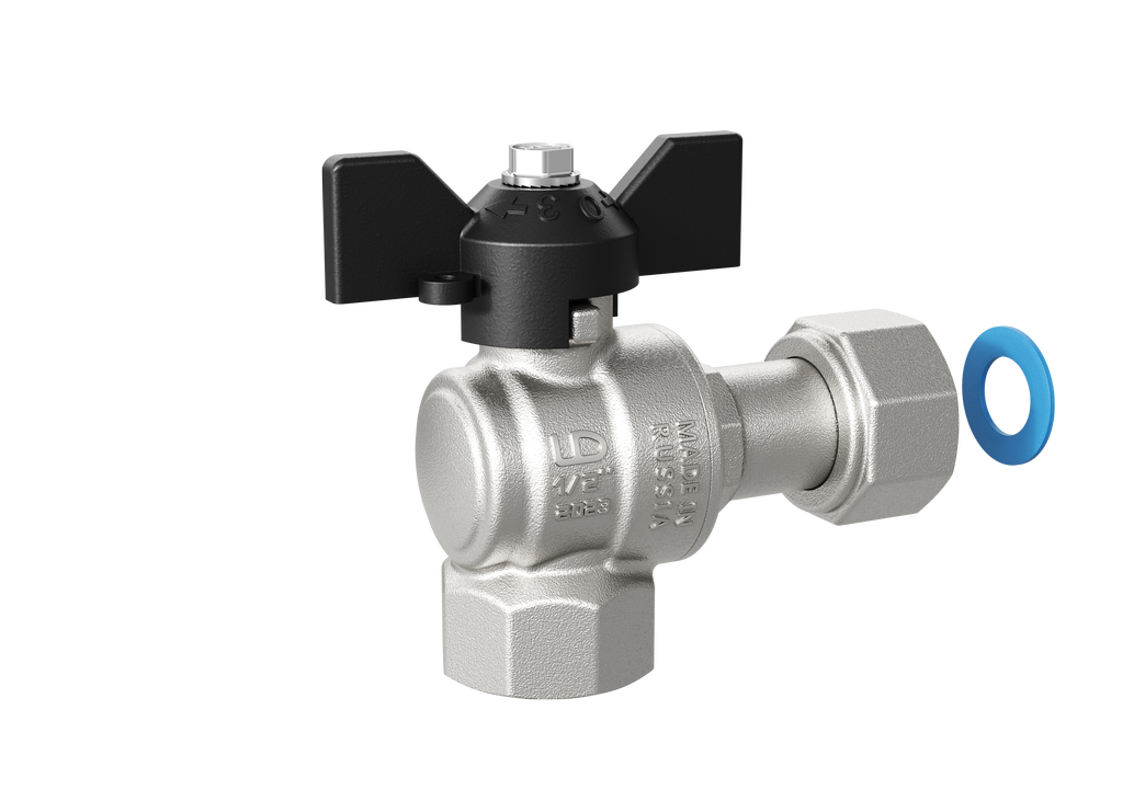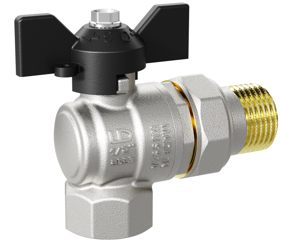 (VT.266.N) Кран шаровой угловой с накидной гайкой обеспечивает разбивку трубопровода на отсекаемые ремонтные участки, выгодно отличаясь от применяемых с той же целью разборных сгонов и шаровых кранов с полусгонами, т.к. не имеет резиновых уплотнительных колец, снижающих температурную стойкость изделия и его общий срок службы, не требует применения специального сгонного ключа при монтаже и демонтаже, компактнее, дешевле и легче угловых кранов с полусгонами, имеет меньше зон потенциальной протечки. Кран шаровой угловой с накидной гайкой и внутренней резьбой VT.266.N разработан на базе серии VALTEC BASE, ремонтопригодный, рассчитан на использование в системах с максимальной температурой рабочей среды 130 °C и номинальным давлением 4,0 МПа. Средний полный ресурс крана – 55 тыс. циклов. Накидная гайка крана соединяется с ответной наружной резьбой трубопровода или арматуры через плоскую прокладку из безасбестового паронита. Монтаж и демонтаж крана производится обычными трубными ключами.