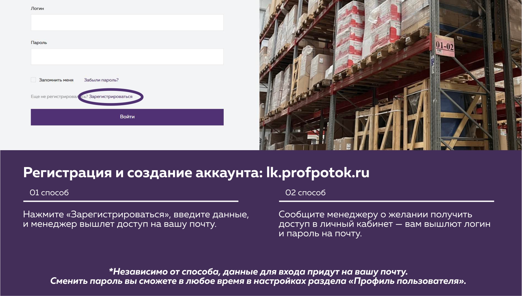 Для начала просто перейдите по ссылке: https://lk.profpotok.ru/. Затем нажмите кнопку «Зарегистрироваться» и заполните необходимые данные.